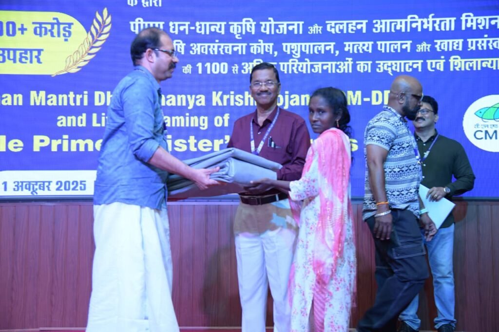 സിഎംഎഫ്്ആർഐയിൽ നടന്ന മത്സ്യകർഷക പരിശീലന പരിപാടിയിൽ ഡയറക്ടർ ഡോ ഗ്രിൻസൺ ജോർജ് പട്ടികവിഭാഗ മത്സ്യകർഷകർക്ക് കൃഷി ഉപകരണങ്ങൾ വിതരണം ചെയ്യുന്നു